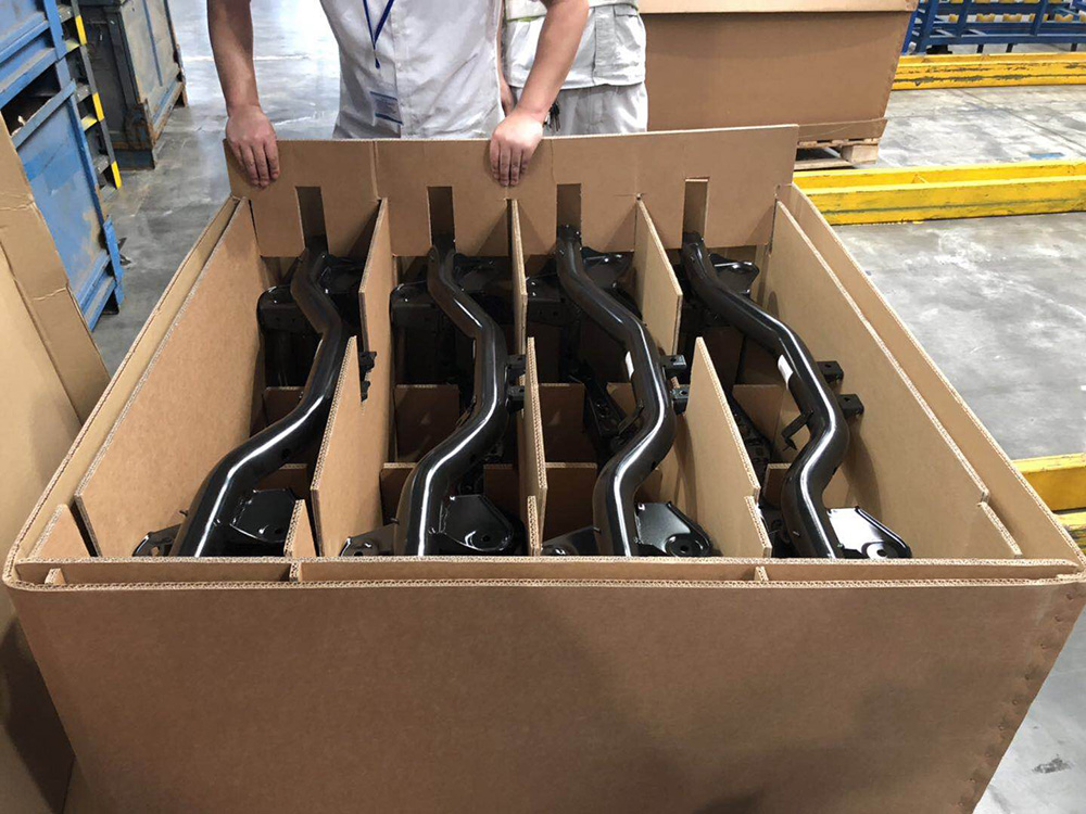 重载型五层瓦楞箱,采用AAA级牛卡纸+蜂窝加固结构,通过汽车物流TL/SL测试标准。内置分隔衬板,可固定发动机/变速箱等不规则部件。